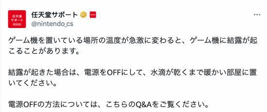 今日,任天堂官方发文提醒:如果游戏机放置区域的温度发生快速变化,游戏机上可能会形成凝露。