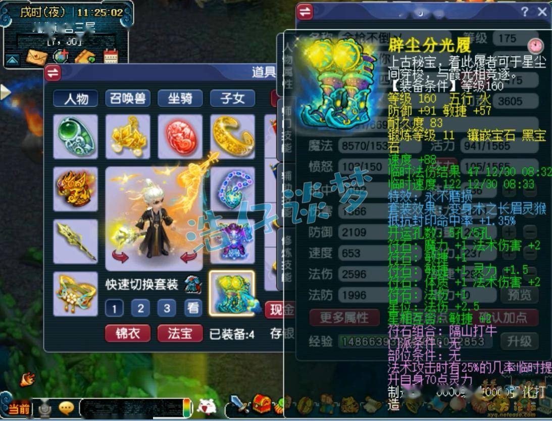 160级永不磨损长眉灵猴套鞋子,附加抵抗封印命中率+1.35%,打了11锻黑宝石!