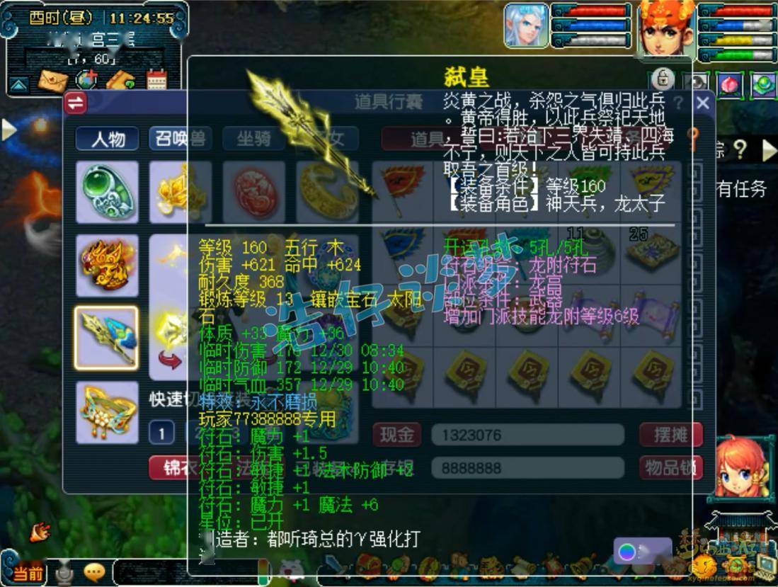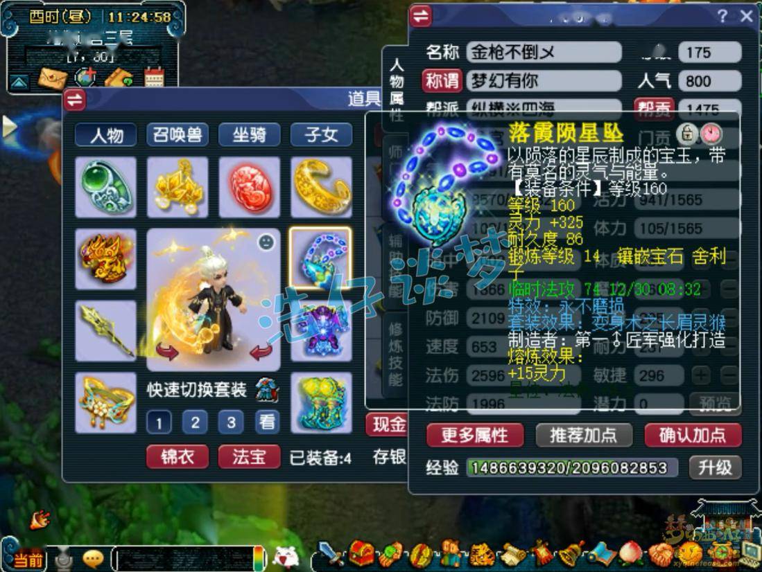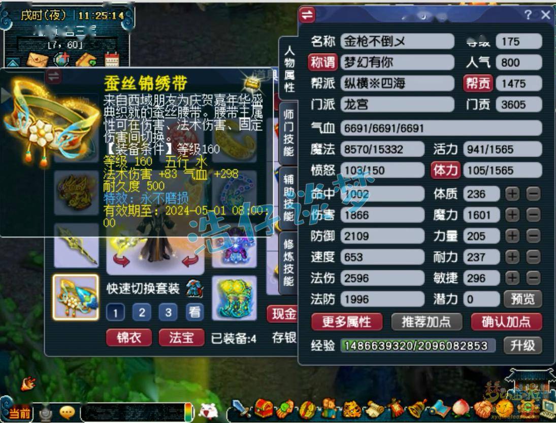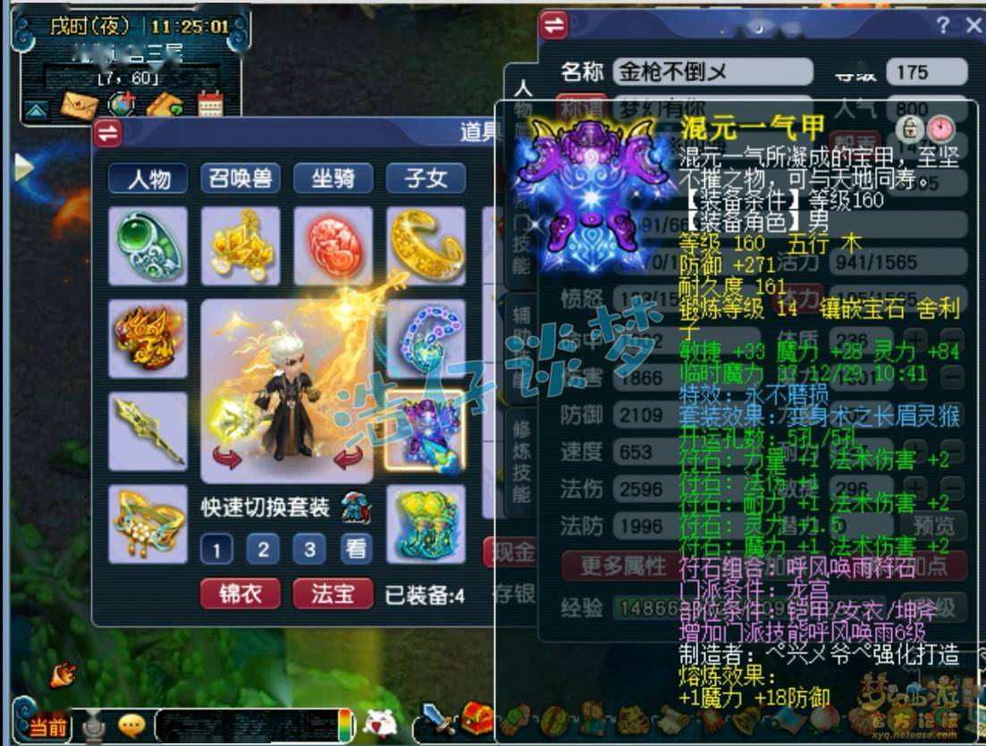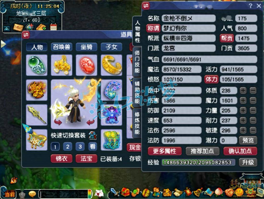 175级龙宫打符没带神器的面板属性,全身永不磨损装备,2596的法伤653的速度,刷任务就是一个字“爽”!