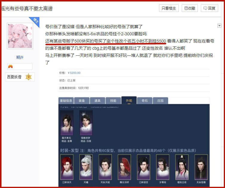 由于很多老玩家的账号角色,进入新赛季之后,会凭借着前一个赛季的积累,拥有更多的备用仓库,还会有一些时装和坐骑优势,因此这些中介商人,则直接选择花500块,买个最基础的白嫖账号,再花200块改个名或者换个性别,就直接用5500的高价挂进藏宝阁的方式赚钱。