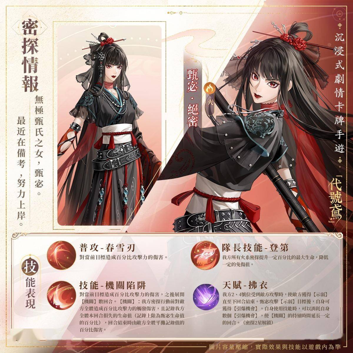 而另一位则是女角色「甄宓」,不得不说「甄宓」真的有一点像阿蝉的远方亲戚哦~哥特式的风格也十分不错呢。首先她的技能是一个单体伤害,同时有一个对敌方群体造成的触发反弹伤害,而这个数值上限取决于「甄宓」的最大生命值,所以对于「甄宓」的命盘来说呢,首先推荐的是「最大生命大幅提升」;同时,「甄宓」的二星天赋也非常重要,它能给敌人叠加一个Buff,同时能延长大招所需要的机关一回合,也就是他会多反弹一次伤害,所以和张角一样,「甄宓」是一个必须要养到二星的密探;与之相关的必备命盘是「压制」,可以搭配这个天赋提高自己的增伤;还有一个可以洗的命盘是「反戈」,会减少机关数量提高一个机关伤害的百分比;同时不推荐的内鬼盘是「暗线」,大家可一定要注意了!