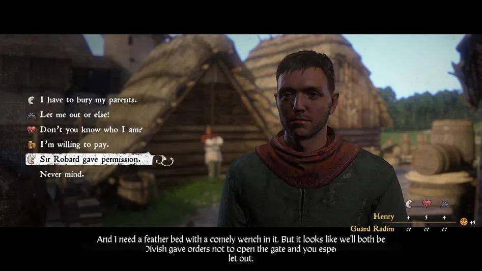 首先,游戏不会让你创建角色。你需要在游戏中扮演亨利(Henry),一个没有任何能力的年轻人。这个没有任何能力是字面意义上的,而不是夸张的说法。对话选项很生硬,往往是你试图用口才去盘问别人结果却侮辱了对方;除了和自己一样的三脚猫,亨利谁都打不过;而且他甚至都不识字——游戏一开始玩家什么书都不能读,除非你付钱让别人教你识字。