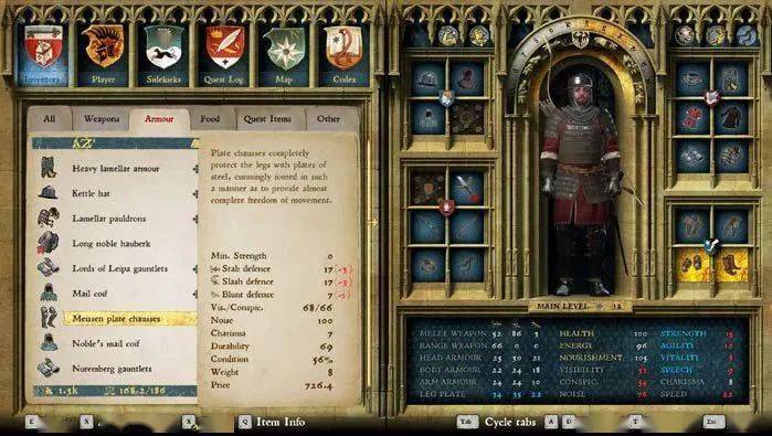 尽管没有种族、职业或法术,但《天国:拯救》有一个丰富的角色系统,包括状态、技能、特长点数和好几层盔甲。