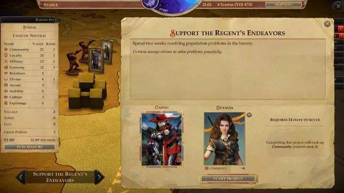 大多数时候,关键在于找到合适的 NPC,并将其安排到合适的官职上。在王国管理这方面,你的队友也拥有不同的性格特点。了解他们的秉性十分重要,毕竟,同样是牧师,一个厌世倾向严重、郁郁寡欢,另一个满腔热忱、积极乐观,他们的行事方式必定大相径庭。有时候,游戏也允许你介入顾问的工作,而无论是干涉还是把决定权交到对方手上,你的选择都会影响团队关系。