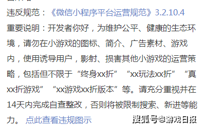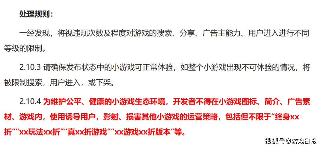 根据该网友提供的截图,游戏日报查询《微信小程序运营规范》小游戏特别规范,看到最新版的规范已经增加2.10.4,“为维护公平、健康的小游戏生态环境,开发者不得在小游戏图标、简介、广告素材、游戏内,使用诱导用户,影射、损害其他小游戏的运营策略,包括但不限于“终身xx折”“xx玩法xx折”“真xx折游戏”“xx游戏xx折版本”等。”