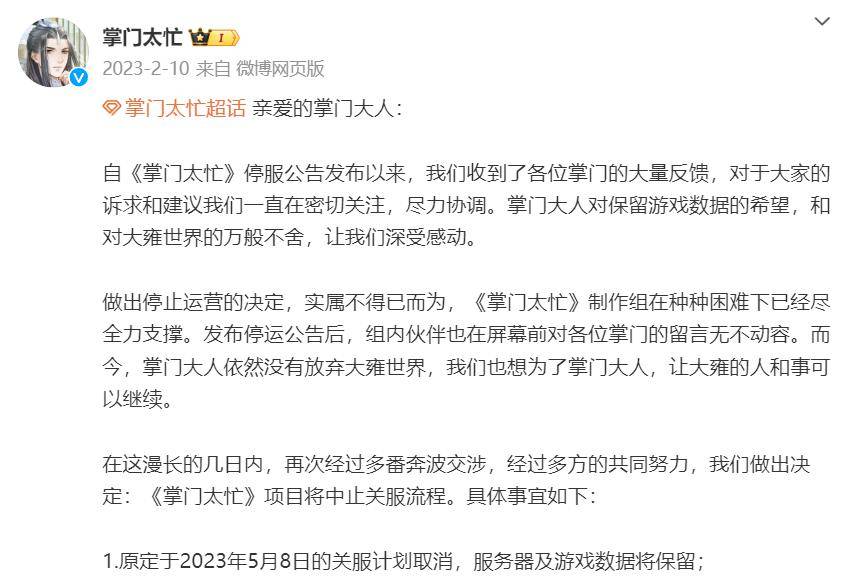 这种“最后割一笔韭菜就跑”的做派,无疑激起了玩家的怒火,恰逢隔壁《云裳羽衣》同样遭遇停服危机,玩家上诉中消协后成功维权的先例,315又近在眼前,可谓“派头,噱头,苗头”一应俱全。于是在玩家的联合上诉抗议中,《掌门太忙》的停服进程得以暂停。