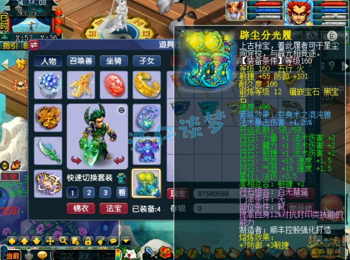 160级混沌兽套鞋子,附加法术暴击伤害+4.26%,打了12锻黑宝石!