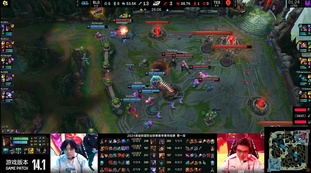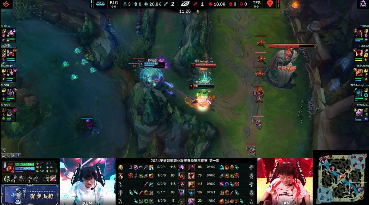 除了Xun的火男打野效果出奇的好以外,下路前期的设计也是让TES这场比赛溃败的原因。BLG的下路丛刃双射手组合靠着一级的强势,直接通过下路改动的地形从红方三角草丛绕后,将TES的下路双人组血量打低。这也让BLG的打野火男可以在野区毫无忌惮入侵,靠着前期设计和更深的版本理解,BLG最终顺利拿下了第一局比赛。