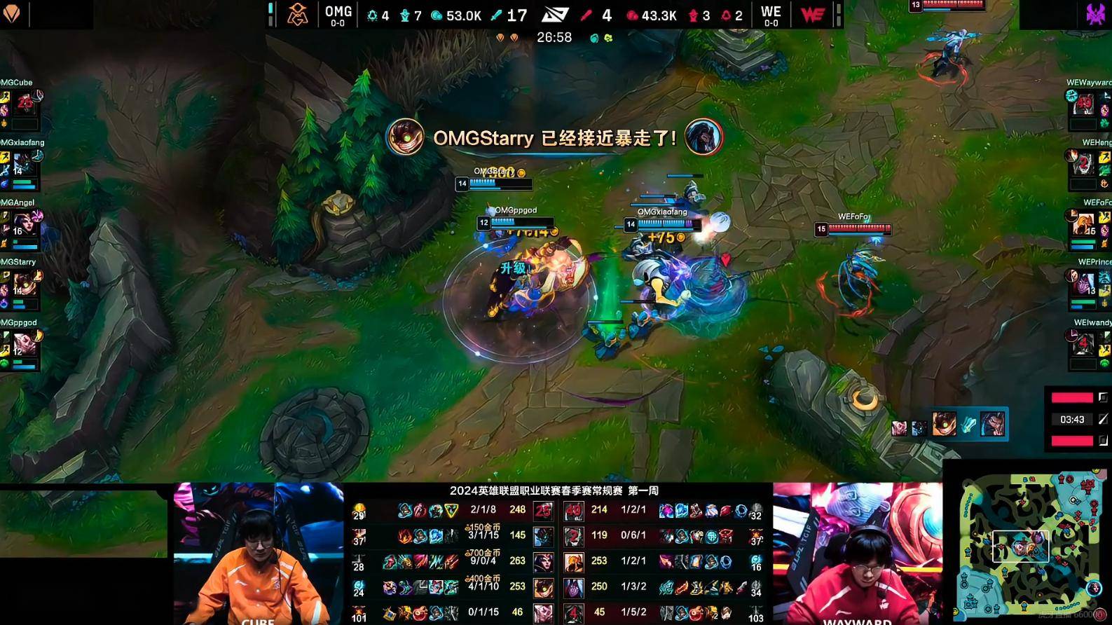WE在43分钟拉扯推掉OMG的中路高地,但在撤退的时候被OMG开团将三人击杀,OMG强势选择硬拆直接拿下第一局比赛胜利。