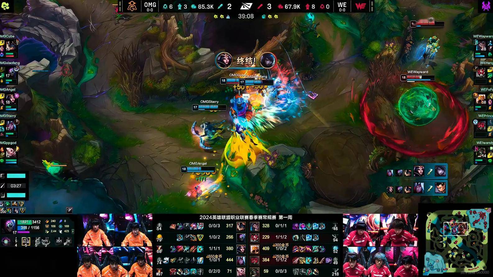 WE前期野区资源控的不错,拿到了两条小龙与两个虚空巢虫还控下了峡谷先锋。但在中期开始阶段,WE打团被OMG碾压,OMG通过多次团战将优势扩大,Angel的妖姬与Cube的贾克斯,在团战中给到WE太多的压力。
