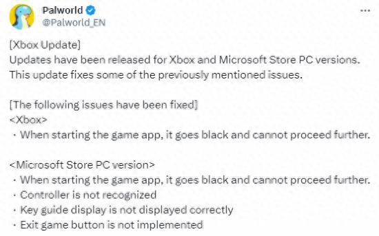 勤快的《幻兽帕鲁》官方再次对游戏的Xbox和微软商店PC版进行了更新,修复了上个更新中遗留的黑屏、手柄无法识别、键导显示不正确、没有退出游戏按钮等问题。