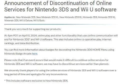 目前,任天堂正式确认了3DS与WiiU的网络服务将于4月9日上午8点正式终止。