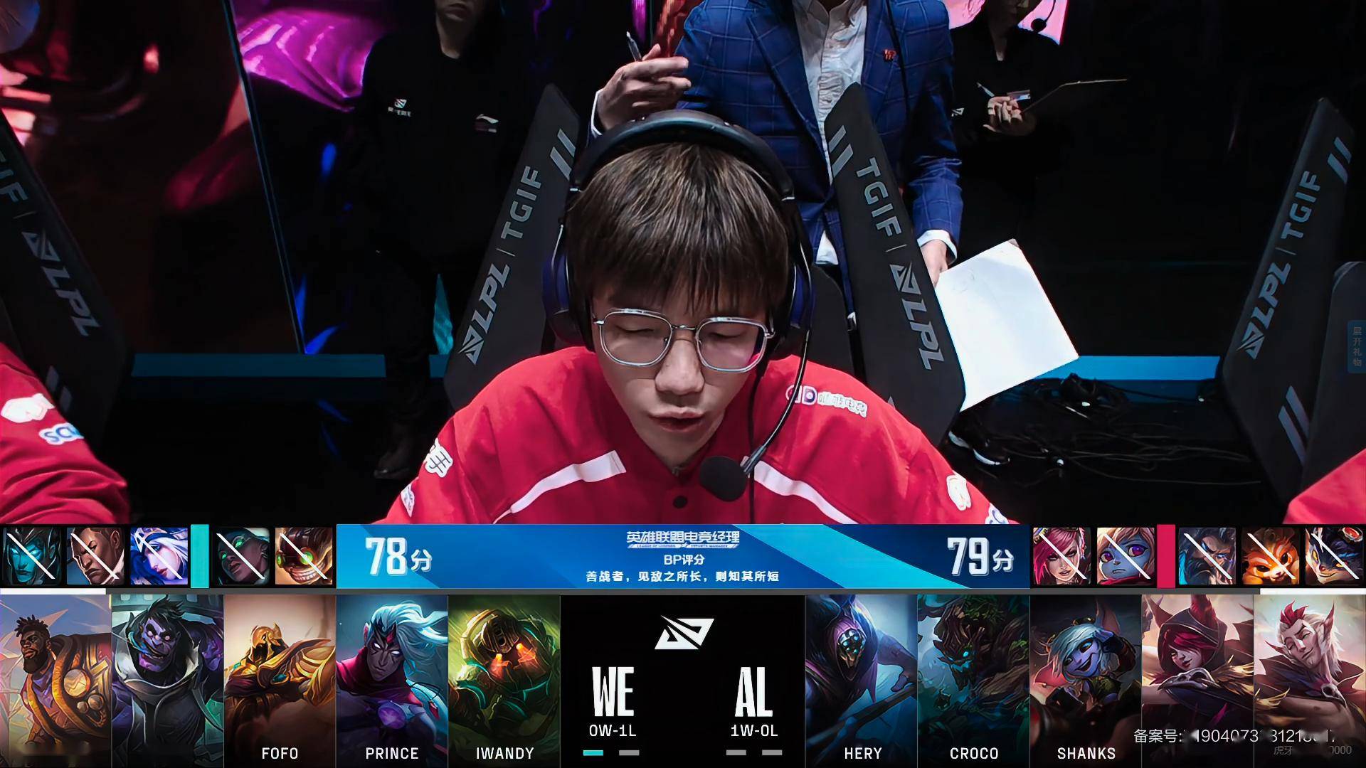 等到第四条小龙的时候,WE的巴德大招金身定住AL发条,奎桑提抓住机会压起身,将AL发条击杀,WE顺利拿下小龙。随后25分钟WE奎桑提再度如法炮制再度将AL发条击杀,顺带着将烈娜塔收掉,这一次WE拿下大龙。这条大龙只让WE推掉了AL的中路高地防御塔,WE又拿到第二条大龙,这条大龙让WE拿下了AL的主基地,王子更是在高地上斩获五杀,最终WE拿下第一局比赛胜利。