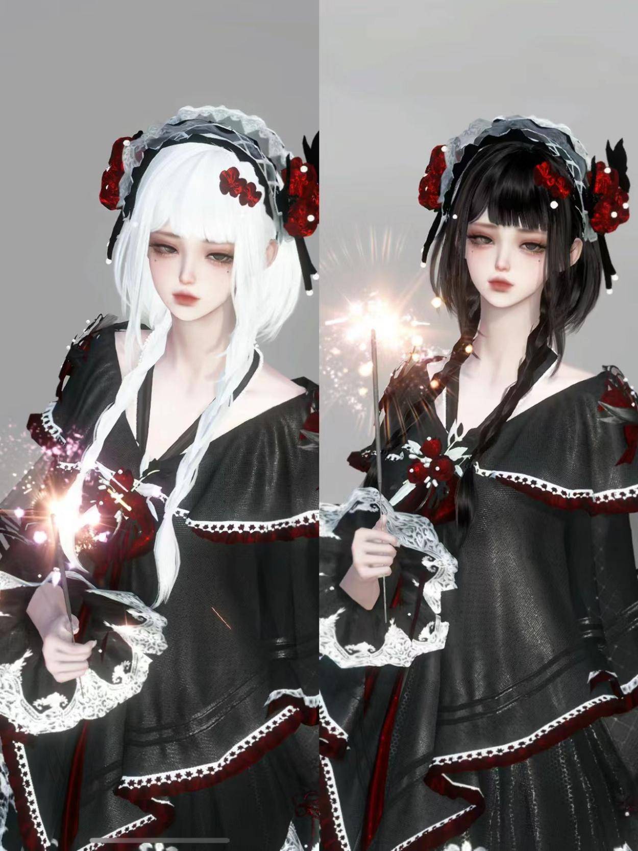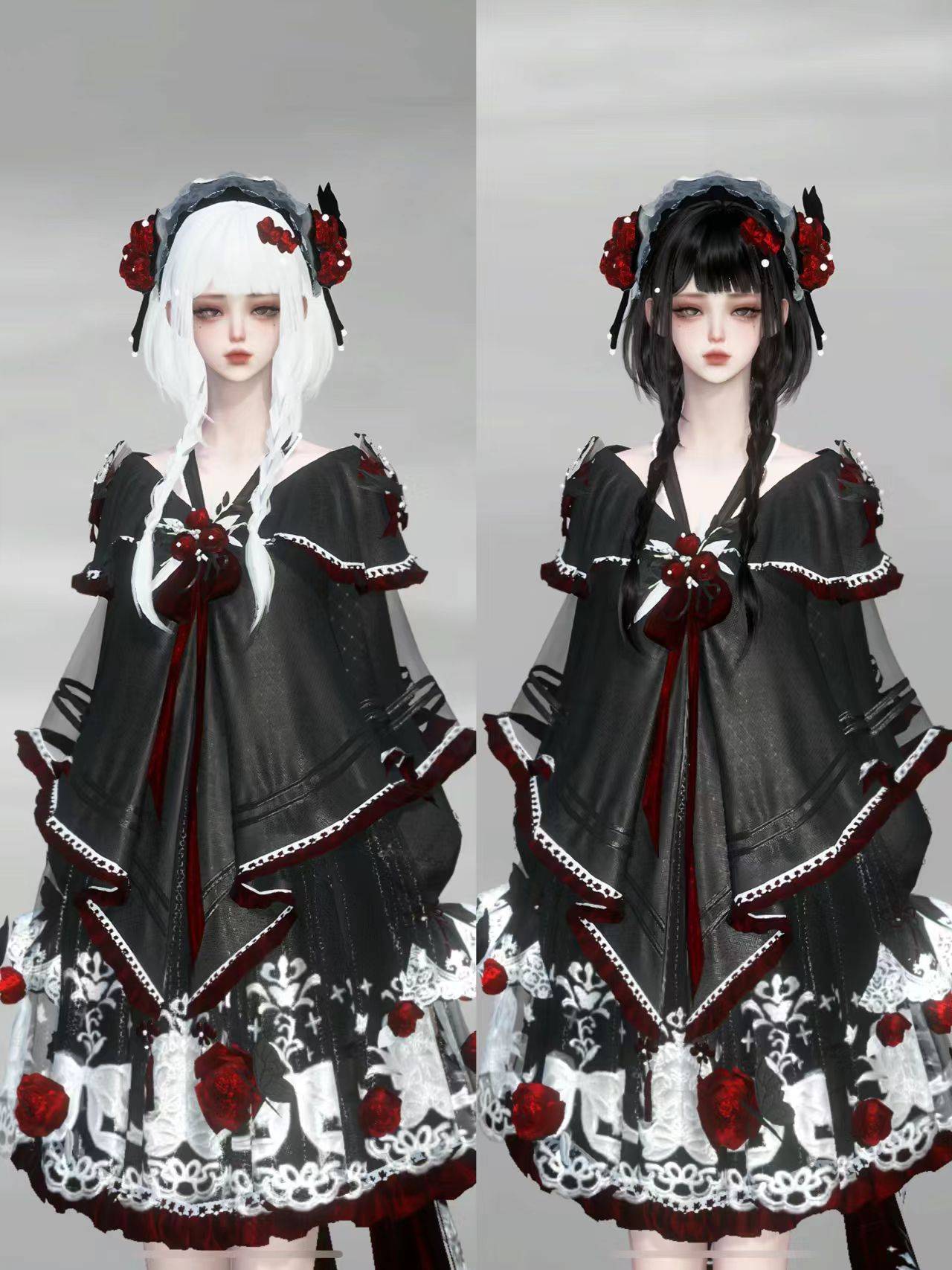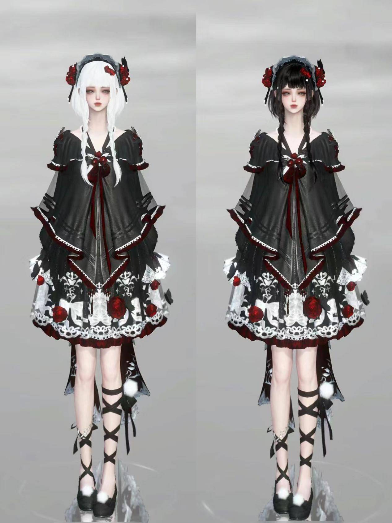 这套很有“哥特”风味的黑森林双生玫瑰蛋糕真的很有特色!大面积的黑染与赤红的玫瑰交相辉映,搭配白发会有种一种病娇感,搭配黑发又显得超级乖巧!这裙摆上绽放的玫瑰真的是戳进小编的心巴里了!