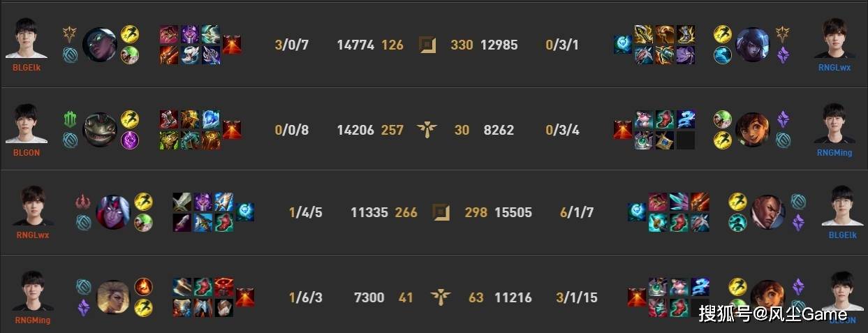 第一场比赛,MING不到2分钟就被线杀,下路全程被压制,根本没有反抗之力,而第二场比赛,拿出月男+明烛,对线BLG的塔姆+塞纳抗压组合,RNG下路不仅没打出压制力,反而被BLG双人组压制,甚至连塔皮都被吃,这对组合,比摆烂队LGD、UP的下路,还要夸张。
