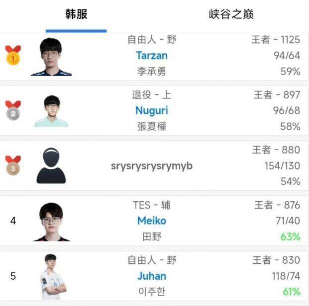 目前的韩服排名就是这样,随时都有可能变动,不过tarzan的第一名还是比较难撼动的,毕竟他目前是所有玩家里面唯一一位打上王者1000分以上的,第二名到第六名都是800多分,变动的可能性还是很高的,你们觉得这种段位分重要吗?对此你们有什么想说的吗?