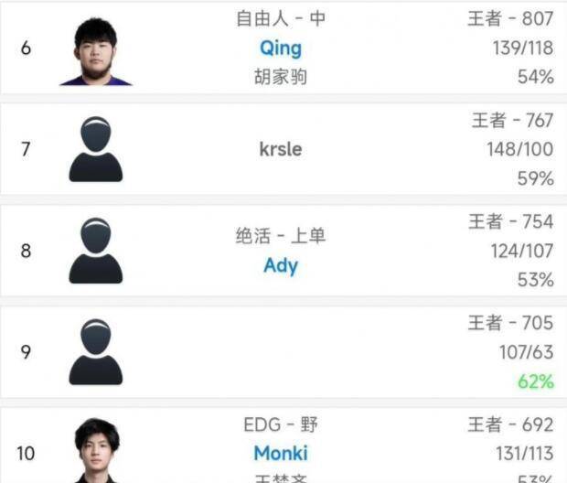 然后说说三位LPL的选手,第四名是meiko,他是目前职业选手中,辅助段位最高的选手,很多人都调侃,说meiko这是替辅助玩家们争口气啊,还有第六名是Qing,他是职业选手,但是是自由人,然后是第十名,是EDG的打野monki。