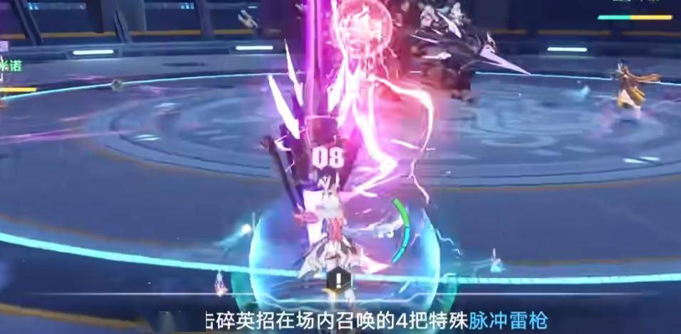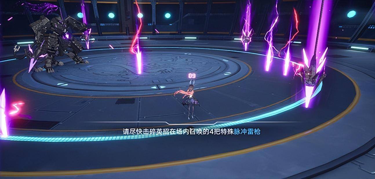 然后是这个雷枪,英招会在场内召唤4把脉冲雷枪,每把枪都需要击打50次,所以建议大家带一把攻速快的武器,当这4把雷枪全部被击破的时候,BOSS就会损失10%的最大生命值,并且范围内的玩家还会一处5层雷劫印记!但是如果雷枪没有被全部破坏拆除,那么久会造成全屏的高额伤害!