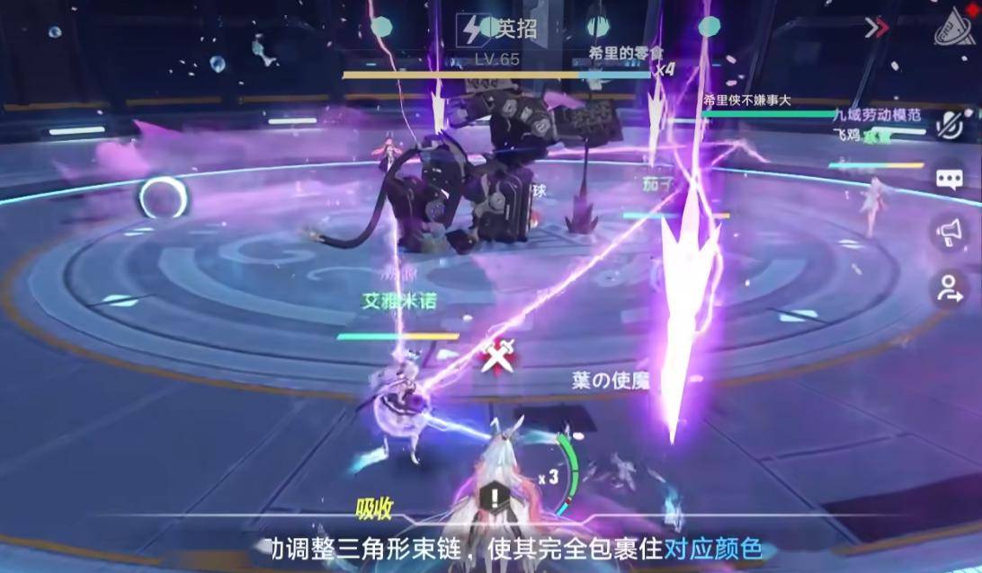 第三个机制是雷电束链,玩家之间会形成三角形束链,场内也会产生蓝色和紫色两种颜色的雷枪,玩家需要通过移动去调整束链的位置,当蓝色束链框柱蓝色雷枪,紫色束链框柱紫色雷枪时即为成功,此时BOSS会掉血并停止攻击。