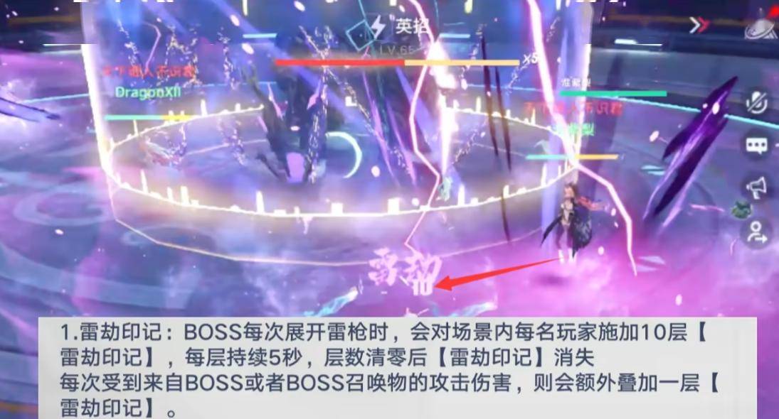 首先第一个是雷劫印记,进入战斗之后,可以看见地上有两个清晰明显的雷圈,范围内会产生落雷,并且会在玩家附近标上雷劫层数,BOSS展开雷枪的时候会对场内所有玩家施加10层,另外,每次受到BOSS的攻击时,玩家还会额外叠加一层印记,当然,如果一直没有受到伤害,雷劫印记也会慢慢掉。这个印记主要是在BOSS点名的时候起作用,BOSS会随机点名场景内的2名玩家,并在他们身边讲下一次大范围的落雷,每层印记都会提升BOSS的攻击力!