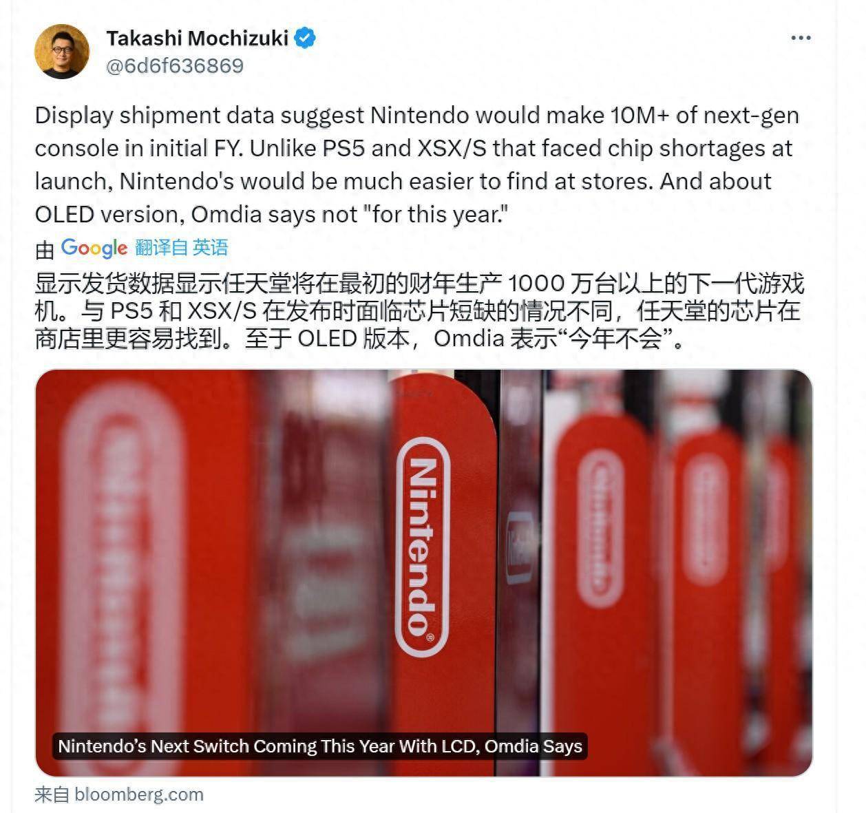 在彭博社报道Switch 2将搭载8英寸的LCD屏幕并在今年发售后,彭博社另外一名分析师Takashi Mochizuki在X上进行了补充。他表示根据屏幕出货量数据,任天堂在Switch 2发售的第一个财年内应该会生产超过1000万台,因此玩家根本不用担心买不到问题。