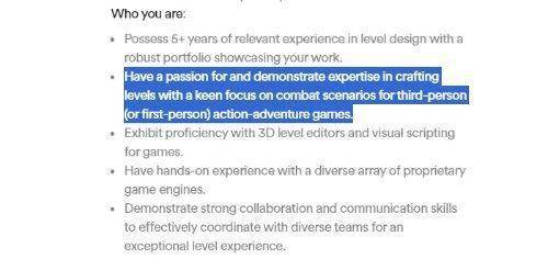 尽管这份招聘广告提到了第三人称玩法,但正如前面提到的,从先前的招聘广告中,我们已经知道这将是游戏的核心要素。然而,特别强调了第一人称战斗仍旧是值得注意的。