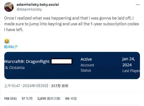 不过这并不是什么盗窃公司财产的行为,暴雪会给在职员工提供自家游戏时间的兑换码,已经是“众所周知的员工福利”,Adam只是多年来并未使用这些兑换码,直到被裁员时他才将这些兑换码转换成游戏时间。