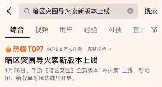 1月25日,《暗区突围》上线了全新大版本“导火索”。从玩法层面讲,新版本已开放普瑞森矿洞,未来还将解锁埃尔米拉矿区和全新载具等一大票内容。随着新版本的曝光,相关资讯、信息解读随之集中爆发,一度将相关话题抬升至抖音热榜前十。