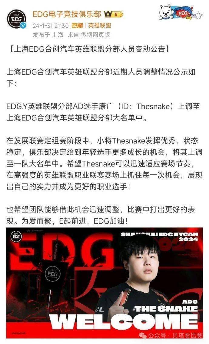 EDG在31号晚上突然发布官宣:表示二队AD选手Thesnake升至一队。并且认为TheSnake在LDL发挥出色,状态稳定,俱乐部决定给年轻选手更多成长的机会,希望他可以抓住每一次上场的机会,提升自己。