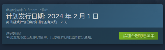 steam商店显示这款游戏计划发行日期为2024年2月1日,还有两天就可以和大家见面了,实在等不及可以先将其添加至愿望单,能收到最新消息通知。