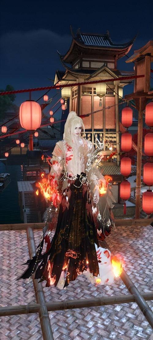 也有玩家将【火鸾鸿衣】时装染成了黑色,黑色上衣尽显威武霸气,下身红黑配色十分有质感,搭配白发后仿佛魔尊降世一般,威震四方。