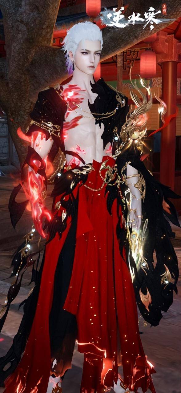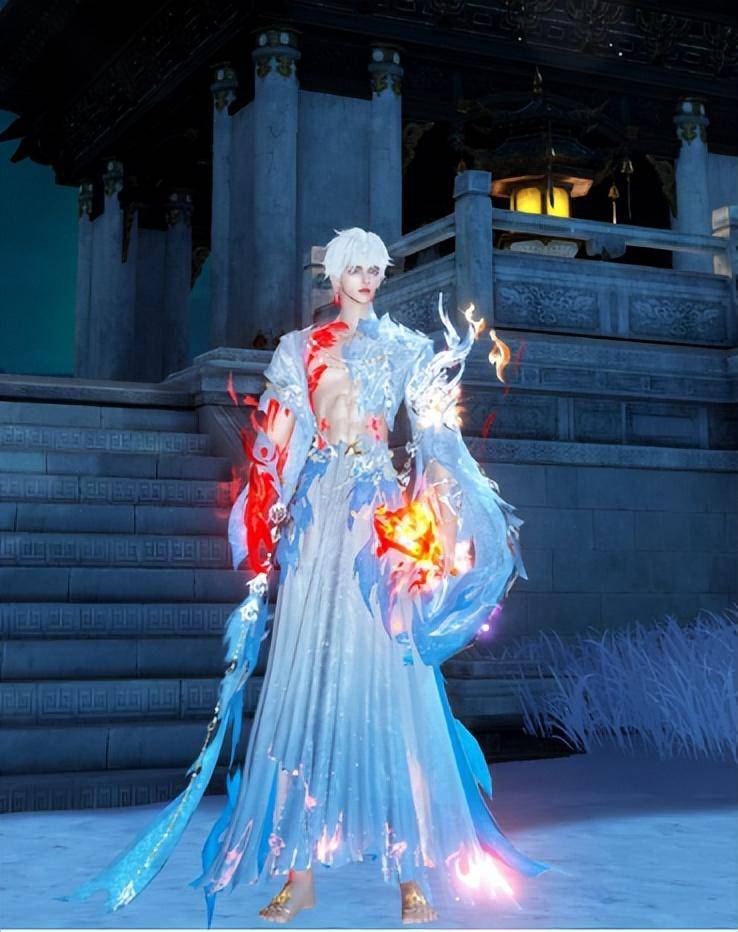 男款时装【火鸾鸿衣】蓝白染色又是另一种风格,粉白头发搭配蓝白战袍,显得格外清新俊逸,腹肌上的完美线条仿佛精心雕琢一般,让人不由心动。