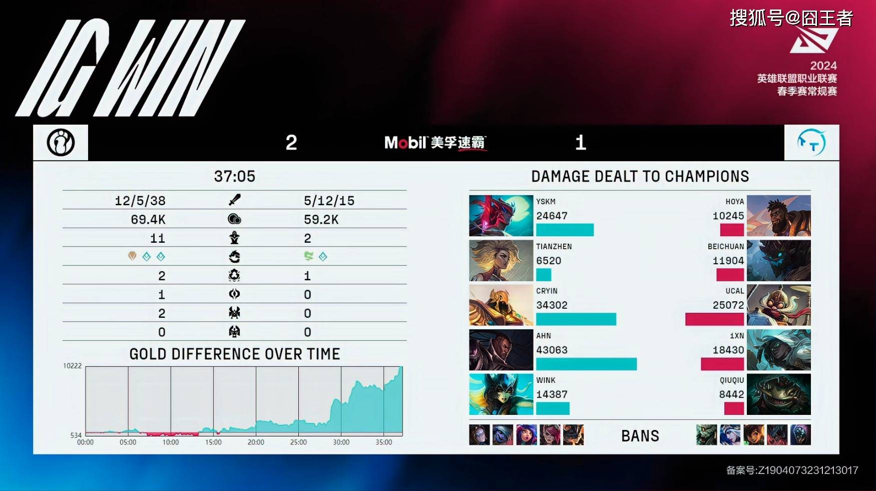 结果决胜局中,两队在前25分钟打得有来有回,双方经济一直无法拉开差距,但iG略占场面优势。转折点出现在29分钟左右的大龙团战中,IG强拿大龙,随后永恩大三个,击杀大树和奎桑提。至此,TT才完全失势,无法与iG抗衡,比赛进入iG时间。最终37分05秒,IG再拿大龙后携buff推进,破TT三路拿下胜利!