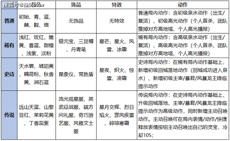 共有四个位置,分别是颜色、饰品、特效、动作,每个位置囊括普通、稀有、史诗、传说四个等级,等级越高,刷新出的概率就越低,当然了有保底,史诗的概率8%,保底15次抽到,传说概率0.8%,保底120次。