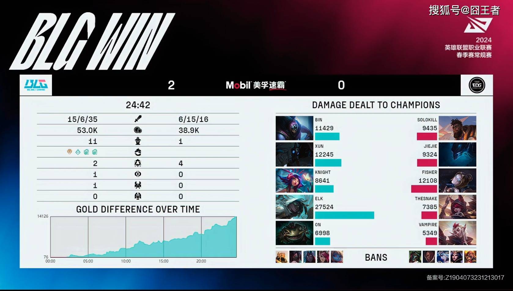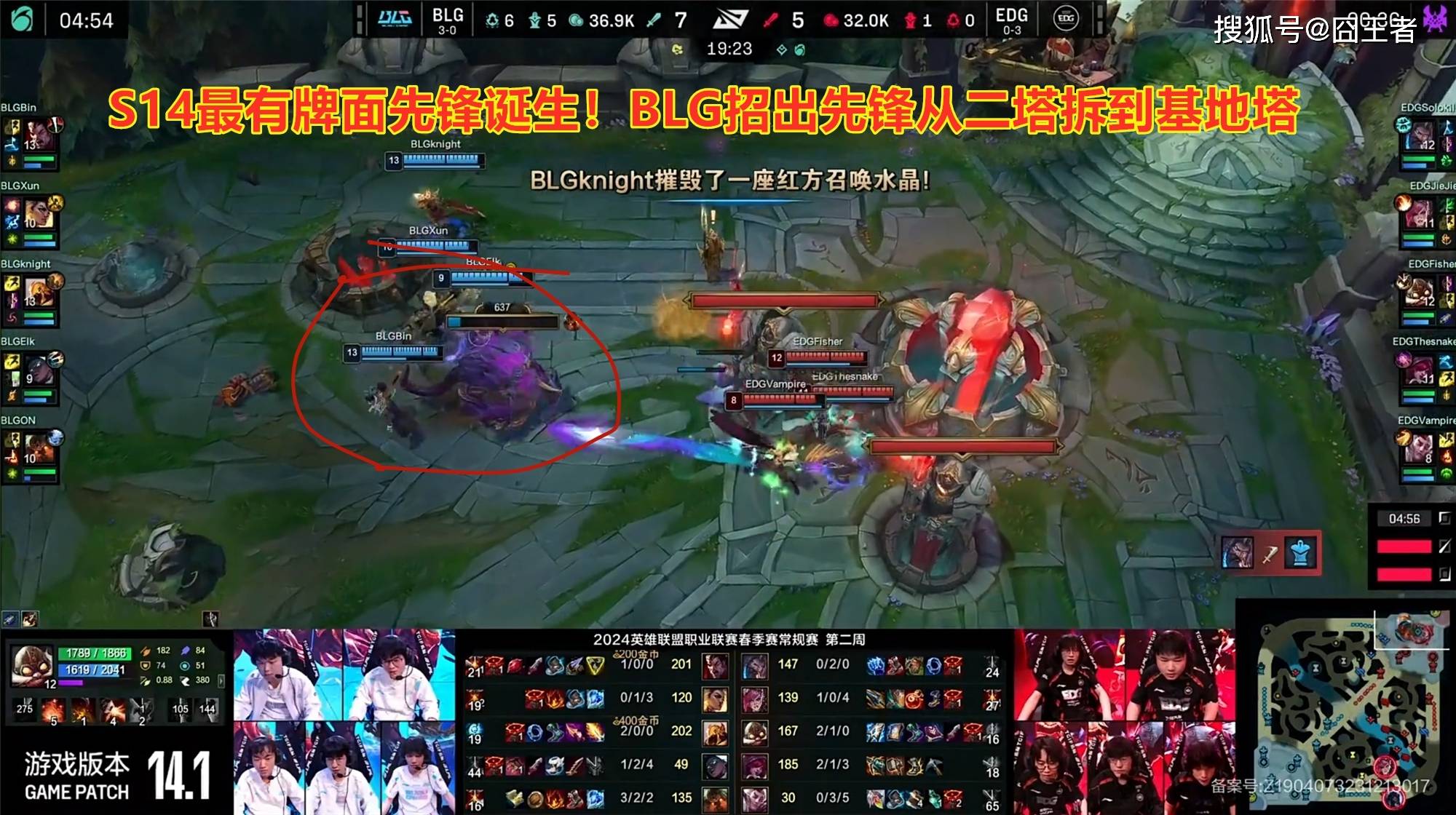 结果BLG这支S+级战队,在第一局直接将EDG打成人机局。小破站从比赛开始,就直接三人在下路越塔,强行击杀洛拿下一血。随后BLG又在中下同时搞事情,逐步滚起了雪球。20分钟不到,2024春季赛最有牌面的先锋出现了,BLG招出先锋,从EDG二塔一直拆到基地塔。最终22分10秒,EDG迅速溃败,BLG先赢一局!