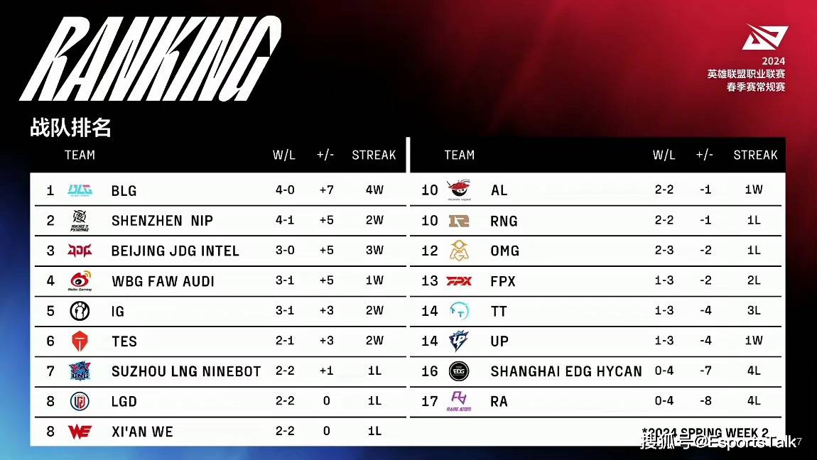 WBG、IG以及TES目前都是3-1的战绩,而WBG和TES本周也将作为电竞春晚的压轴对决登场,中游的2-2队伍有很多,大部分都是目前表现模棱两可的队伍,像LNG刚刚输给了JDG,舆论那叫一个暴力,这周还要打BLG,估计是凶多吉少了,RNG也是输给了WBG,小虎面对老东家也是毫不手软,后面的一些队伍就没什么可聊的了,哦!除了EDG,这支曾经的2021世界冠军战队,如今跟FPX也算是难兄难弟了,因为今年的人员配置上并没有投入很多,加上最近的各种首发排列组合,已经是四连败,跟RA手牵手垫底了,本周他们即将对阵FPX,首胜还是连败?我们也拭目以待吧。