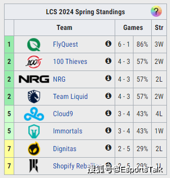 北美赛区这边,三周常规赛过去之后,积分榜还是有些变化的,比如一开始表现不错的C9,却在最近遭遇了四连败,这也让他们的排名一路俯冲到了第五,相反FLY则一直保持着不错的势头,目前也是以6-1的战绩位列联赛第一,紧随其后的是100T和NRG,DIG的情况跟C9差不多,但整体来看实力甚至要更弱一些,他们在上周击败同样吊车尾的SR后,也是再次遭遇连败,目前与SR并列第七名。