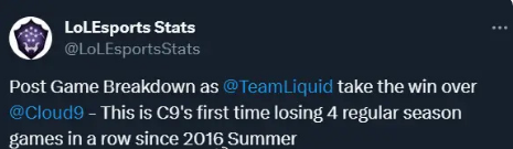不过本赛季以来,C9的内部却出现了问题。春季赛以来的一波四连败,让他们跌出了积分榜前四。(前六才能进入季后赛)别看四连败在海外赛区并不算什么,可这已经是C9最近七年来,所获得的最长连败了。从中不难看出,C9的状态问题有多严重。