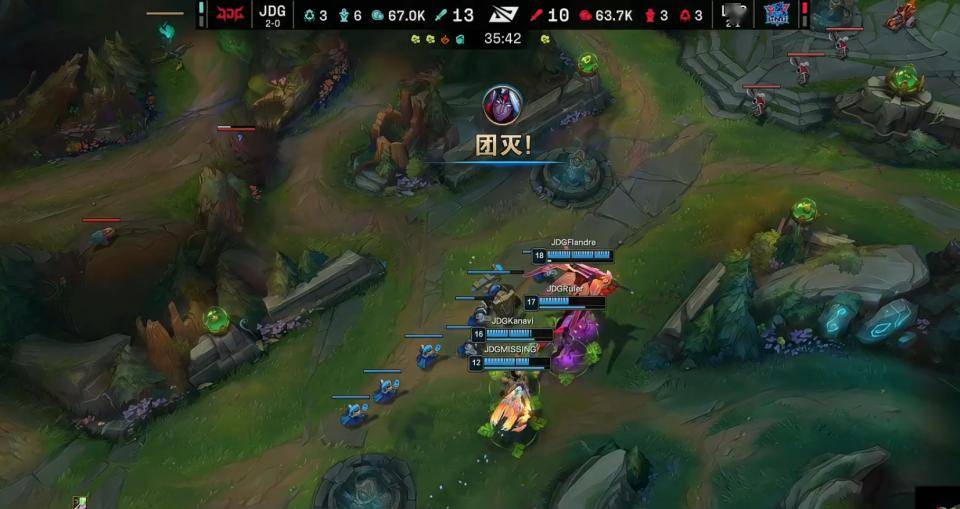 23分钟,上路双方遭遇,尺帝维鲁斯豪取三杀,JDG完成1换5团灭LNG,顺势控下了大龙Buff,最终完成一波。