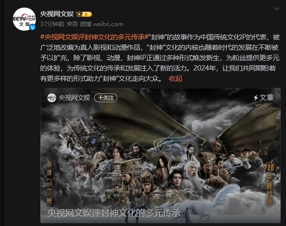 在《封神三部曲》第一部作品于2023年大获成功,斩获26.34亿票房的情况下,央媒在龙年春节到来之际,又专门提出了,希望封神文化向多元化发展,让更多年轻人喜欢上只属于中国人的少年英雄杨戬、姬发、哪吒,弘扬传统文化。