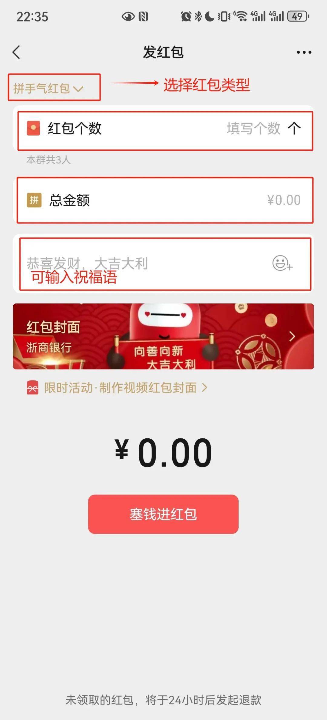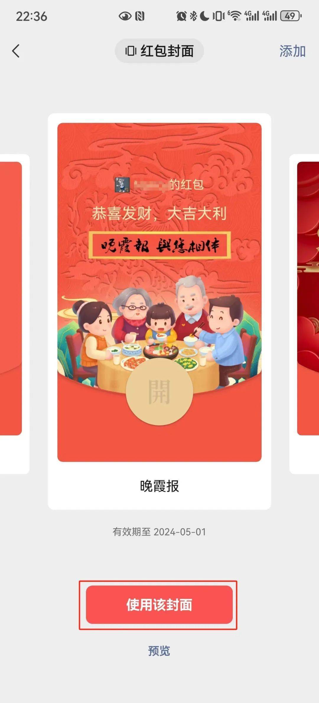 按正常发红包的步骤,选择红包种类,输入红包个数和金额,设置好祝福语,然后点击下方“红包封面”,找到心仪的新年红包封面,点击下方“使用该封面”。
