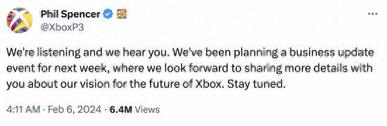 “我们正在倾听,我们听到了你们的声音。我们计划在下周举办一次业务更新活动,期待与您分享更多有关我们对Xbox未来愿景的详细信息。敬请关注。”