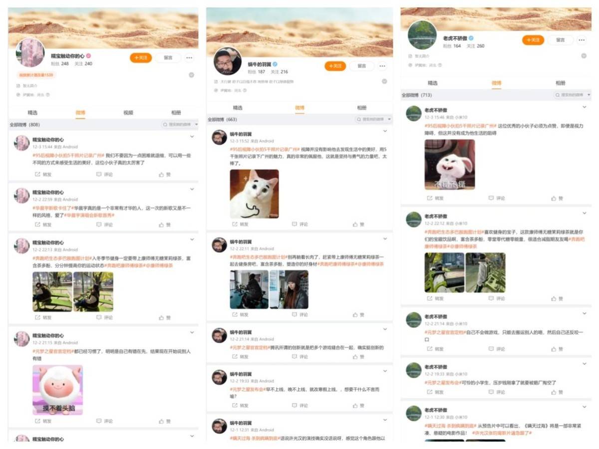 这次同样也有人猜测是不是猪厂找了水军,不过因为操作不当,闹出了不少笑话。首先是很多微博水军账号在元梦定档的那天发布了许多黑评,口吻和表情包都极其相似,点进去账号会发现大部分IP地址都是清一色的河北,连参与的话题也一样,生怕别人不知道是在带节奏。