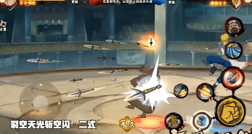 一格能量条后的一技能第一段是会朝前方丢出四枚飞雷神苦无,然后连续瞬身产生攻击。两格能量条后的一技能第一段就有点类似青年水门的一技能了,朝前方扔出多枚苦无瞬身攻击,但百战水门会在收尾的时候追加了一个抓取效果。