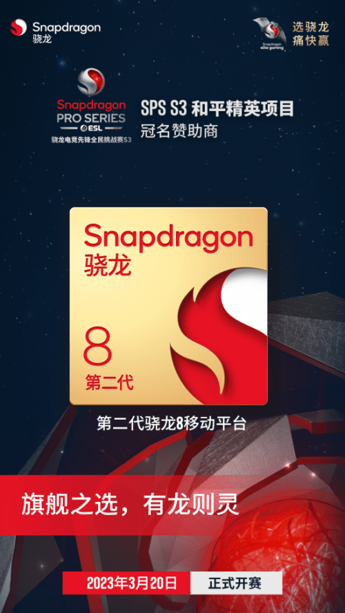 骁龙电竞先锋赛是高通技术公司联合ESL Gaming举办,分为面向大众玩家的全民挑战赛(SPS Open)和职业玩家的精英邀请赛(SPS Master)。SPS S3作为骁龙电竞先锋赛2023年首个赛季,将以深受广大玩家喜爱的《和平精英》作为赛事项目。