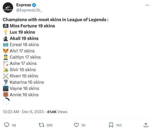 最近外媒Express统计英雄联盟里面最多皮肤的英雄,从这个排名来看,前12名中只有一位是男性,第一名的拥有19款皮肤,一共有3位英雄,都是女性角色,分别是女枪、拉克丝和阿卡丽,这三人并列第一。