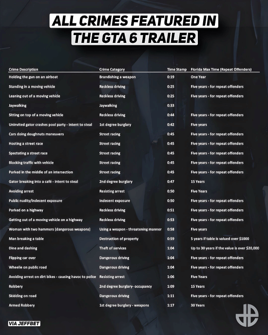 据外媒Dexerto统计,在《GTA6》短短90秒的预告片中,里面的人物共违反了25次佛罗里达州的法律。主要包括入室盗窃、违规驾驶、拘捕、暴露等,最高可能面临30年以上的监禁。