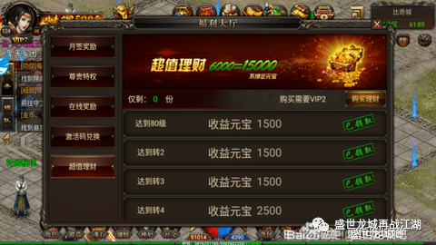 再扯两句元宝咋花吧。可能有的小白进去拿了元宝不知道该弄啥有几个是必备的比如超值理财 天罡战神 尊贵特权这些都是比较实在的东西超值理财就是买过以后达到相应的转生等级给多少元宝。3000元宝收益的话#¥%%#*¥&数学不好就不写了这个确实比较合适反正都得转生,还能拿奖励何乐而不为。(老图找不到我日 应该是开服前一个星期是3000元宝,后边就是6000,对是这个样子。脑筋不好 反正自己看下就明白了)