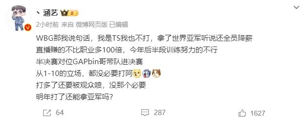 另外,关于降薪一事其实还是可以理解的。毕竟,现在的大环境并不好,而LPL不仅仅只是WBG,不少其他俱乐部都是在降薪。只不过对在2023全球总决赛中拿到亚军成绩的WBG来讲,这样的一份成绩已经是出乎不少人的意料。2023赛季的WBG算得上是比较成功的一支俱乐部,在这样的情况下选择降薪,就好比你在公司上班,努力了一整年把自己的公司干到了行业内第二名的水平。但公司不但没有给你奖励,反倒是选择在明年降薪。这样的情况,恐怕绝大多数人都不太会接受的。当然了,就像前面所说的,LPL俱乐部降薪是大势所趋,如果WBG只是不涨工资的话,与选手们好好沟通,相信选手并不是不明事理的人。但如果在2023赛季取得不错成绩的情况下选择降薪的话,这波操作属实是有些看不懂了。