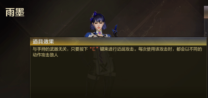 在绝大多数常规模式下,按下E键后,雨墨将使用修罗匕发动一次近战攻击;近战攻击一共有三种攻击动作,三种动作循环使用;除攻速有极小差距外,三种动作的范围和伤害均一致。